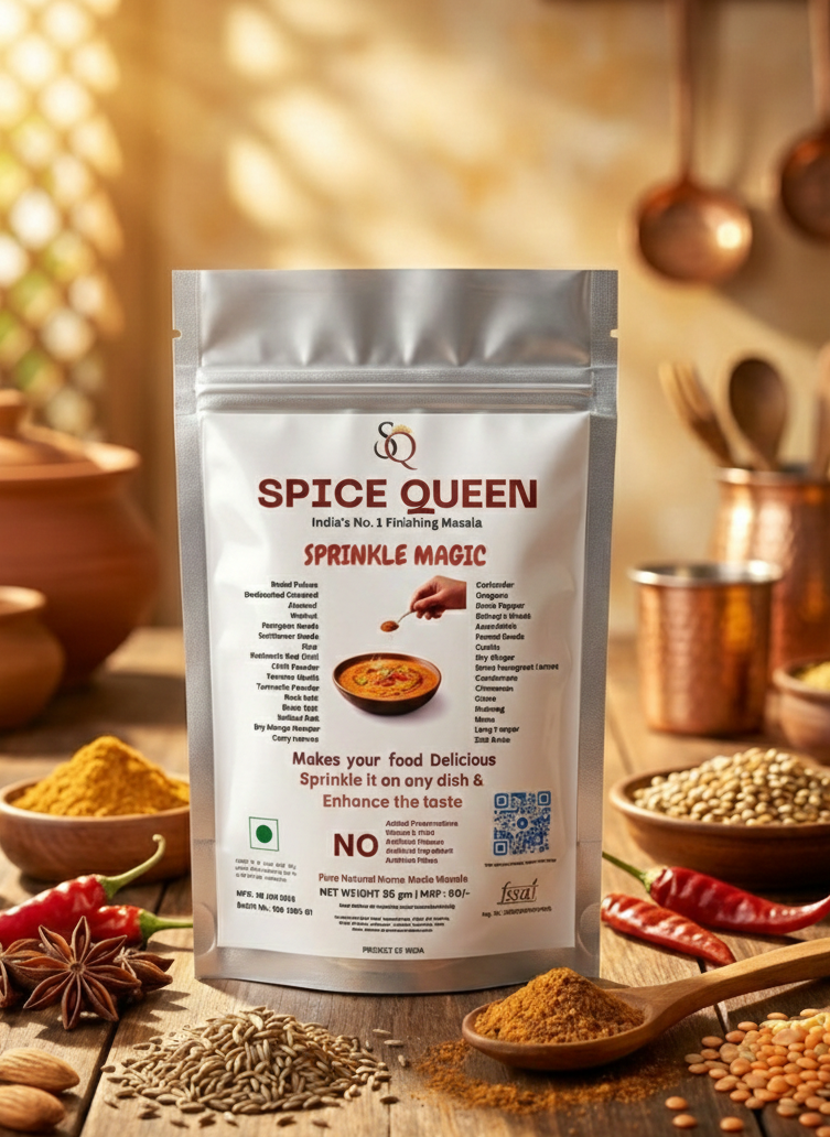 Say goodbye to boring meals with Sprinkle Magic. The all-in-one homemade blended masala is designed to enhance every dish. Whether you're cooking curries, stir-fries, snacks, or even finishing a plate, this Indian spice mix adds a bold aroma and unforgettable taste. Made from 30+ handpicked ingredients and blended to perfection in fine powder form, it's your secret ingredient for delicious, restaurant-style flavor at home. Just pure spice magic in every pinch. No MSG, No Preservatives.